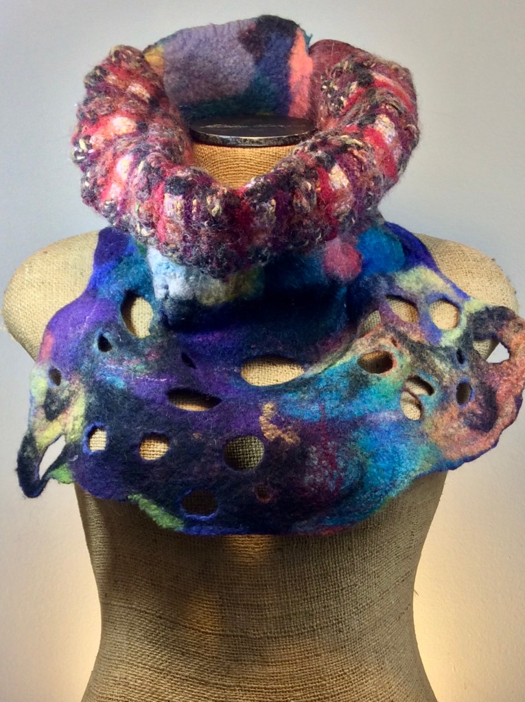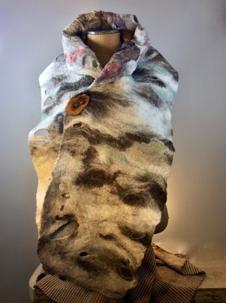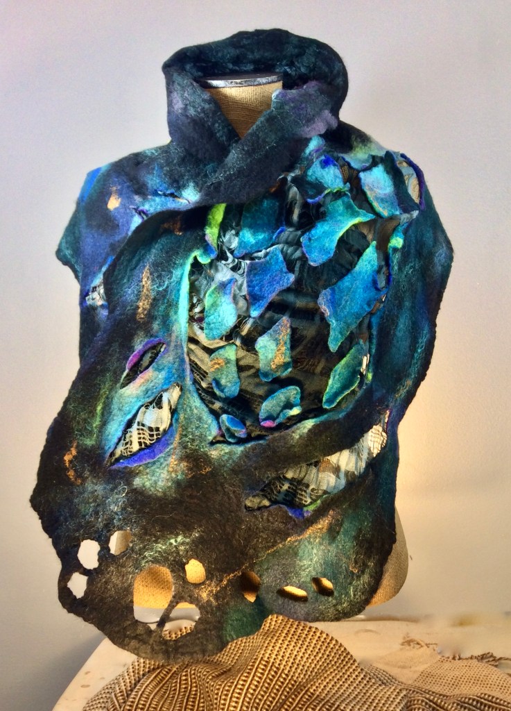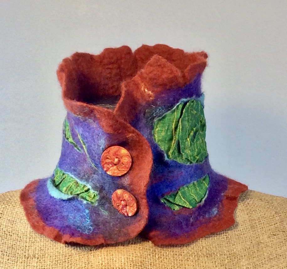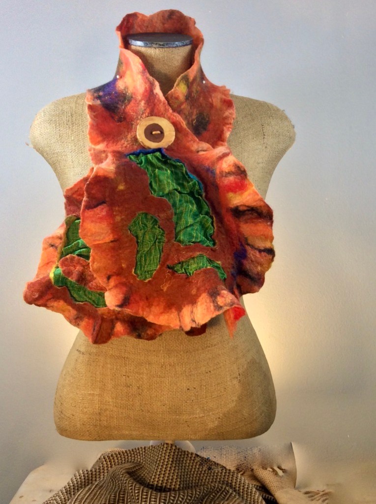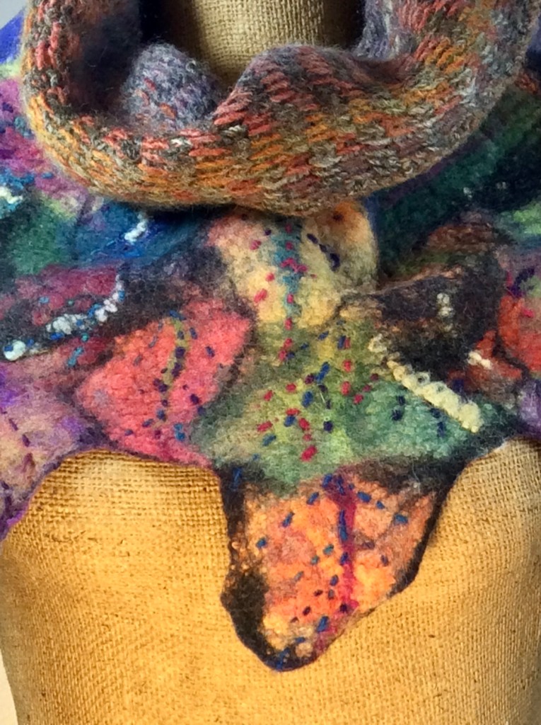 Vintage silk and sari scraps are combined with merino and silk felt in this lovely veggie cowl.