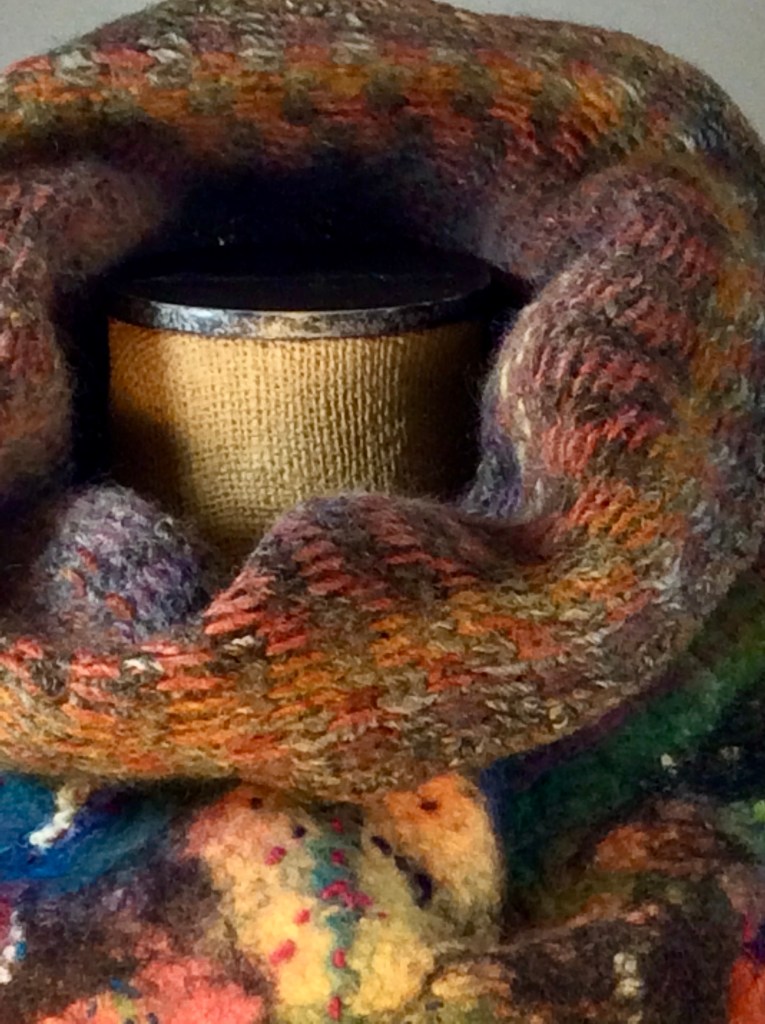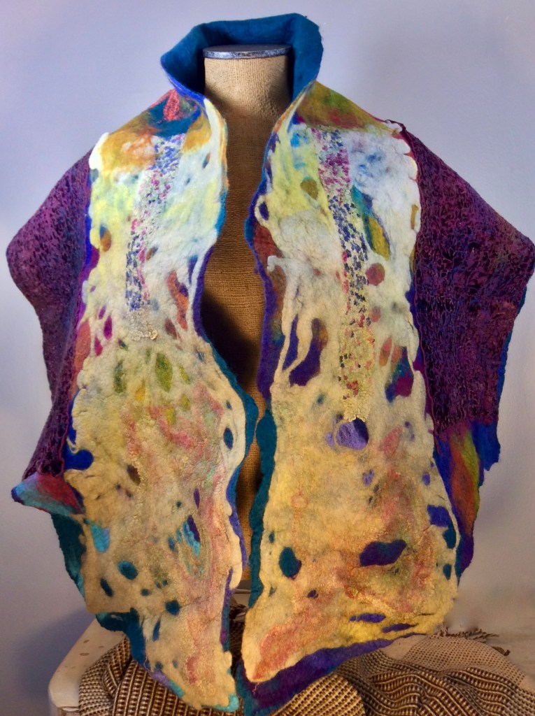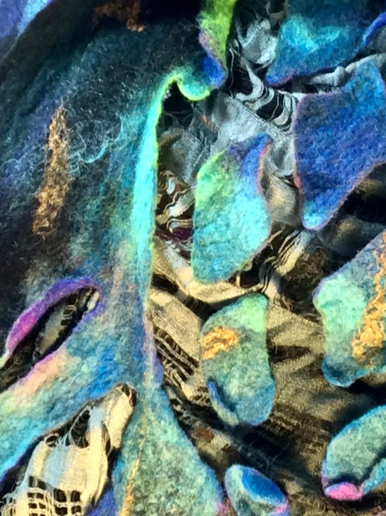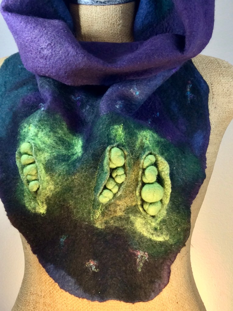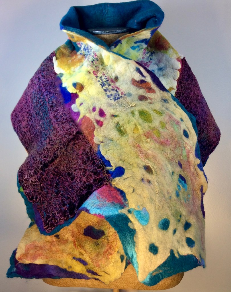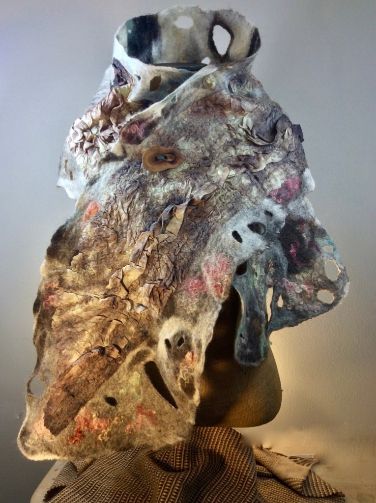 Vintage silk and sari scraps are combined with merino and silk felt in this lovely veggie cowl.