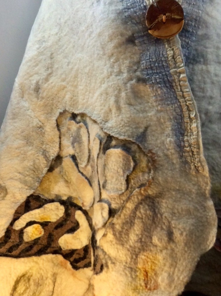 A base of vintage silk flies with the addition of nuno felted merino, alpaca and silk. Closed with a handmade, fallen branch button.