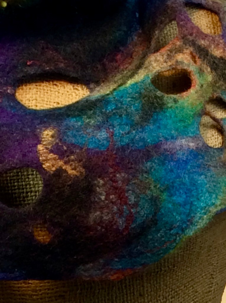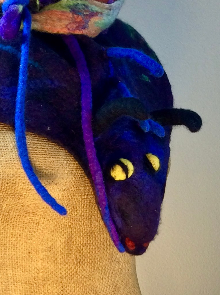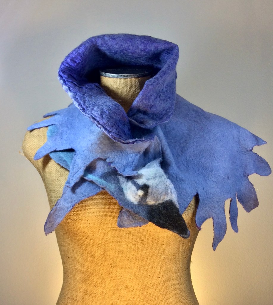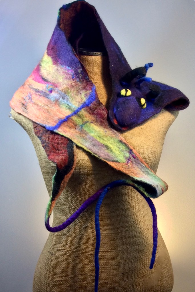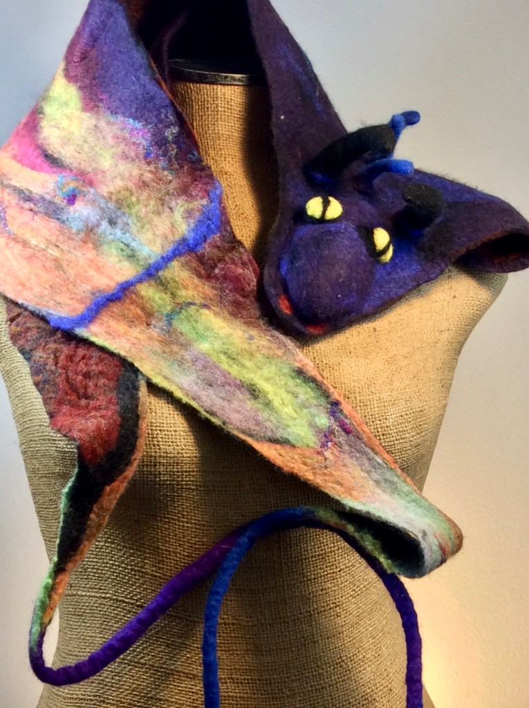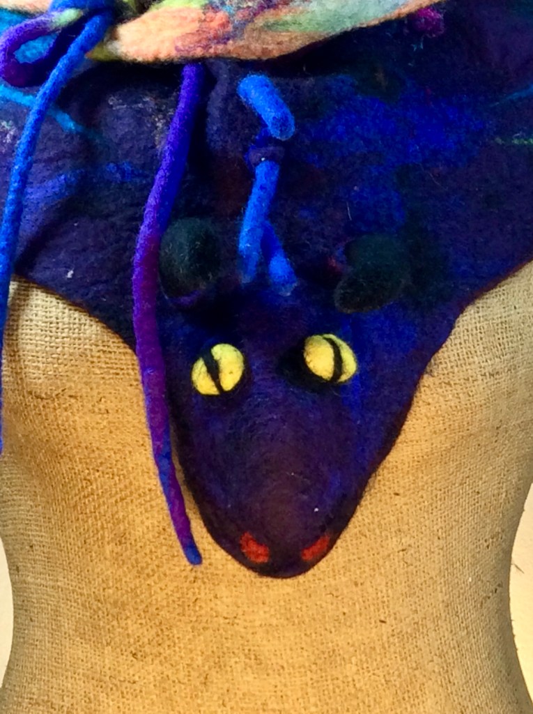 A lighthearted take on GOT, this dragon friend will keep you cozy and warm. Nuno felted on a base of a paisley vintage woven shawl, 3D felt eyes, spikes and a head bring the dragon to life. Use the felted cords to tie it multiple ways.