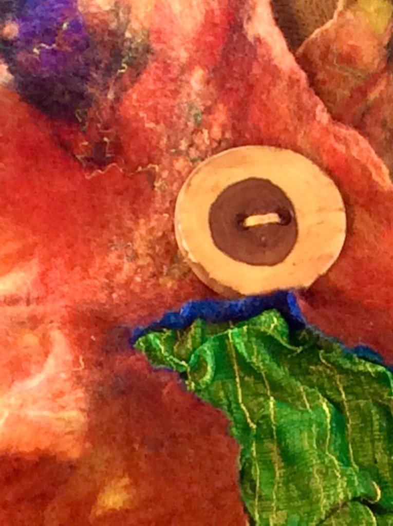 Colourful vintage silks blooms with merino and silk felt. Closed with a handmade tree of life purpleheart button.