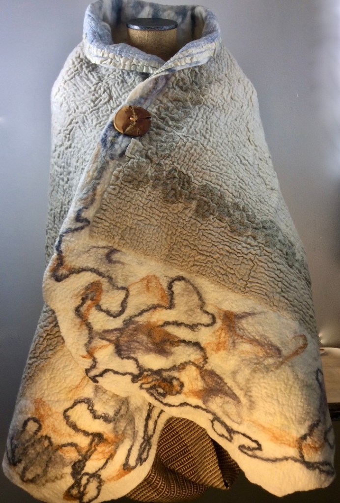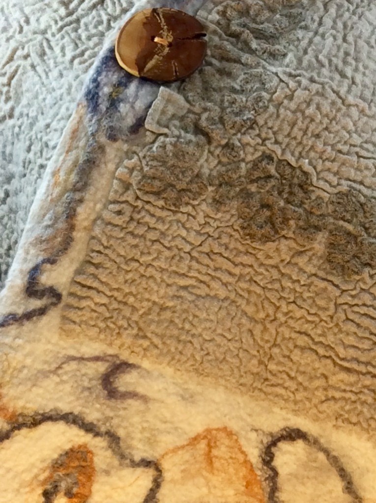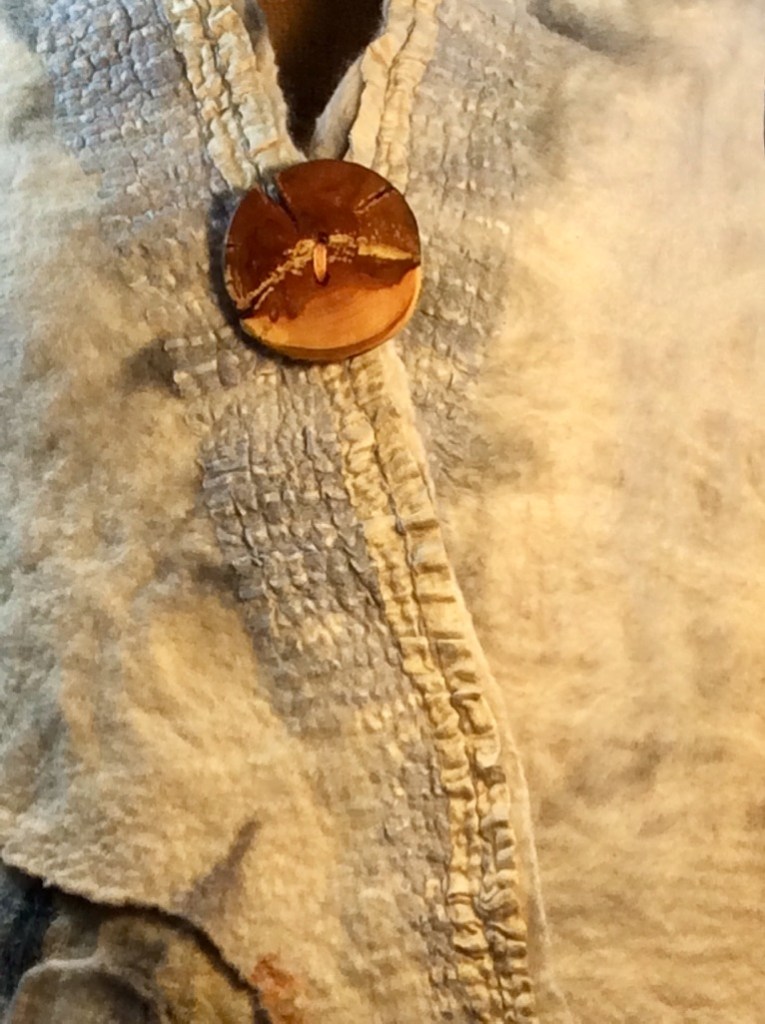 Vintage silk is sweetened with merino and blue faced leicester felt. The chestnut button can be used to wear it lots of different ways.