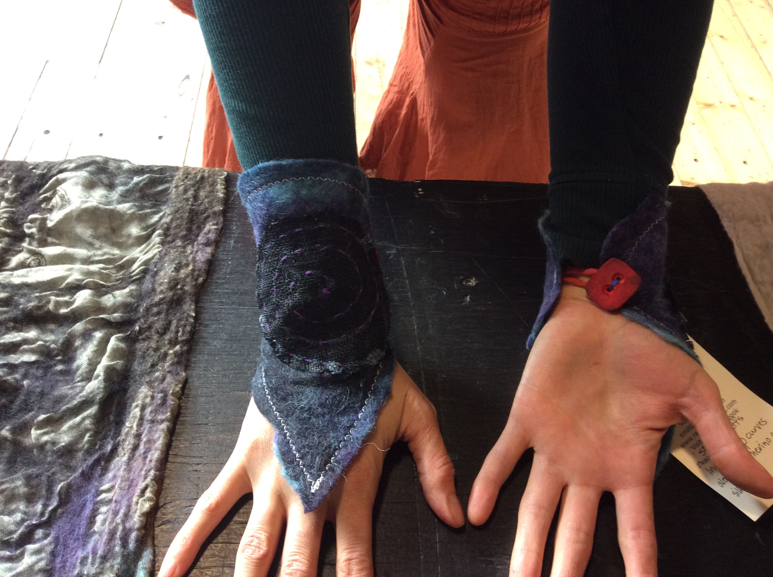 Circled cuffs Published November 17, 2015 at 2592 × 1936 in Collars Shibori bamboo cloth nestles with merino and silk felt cuffs Like Loading...