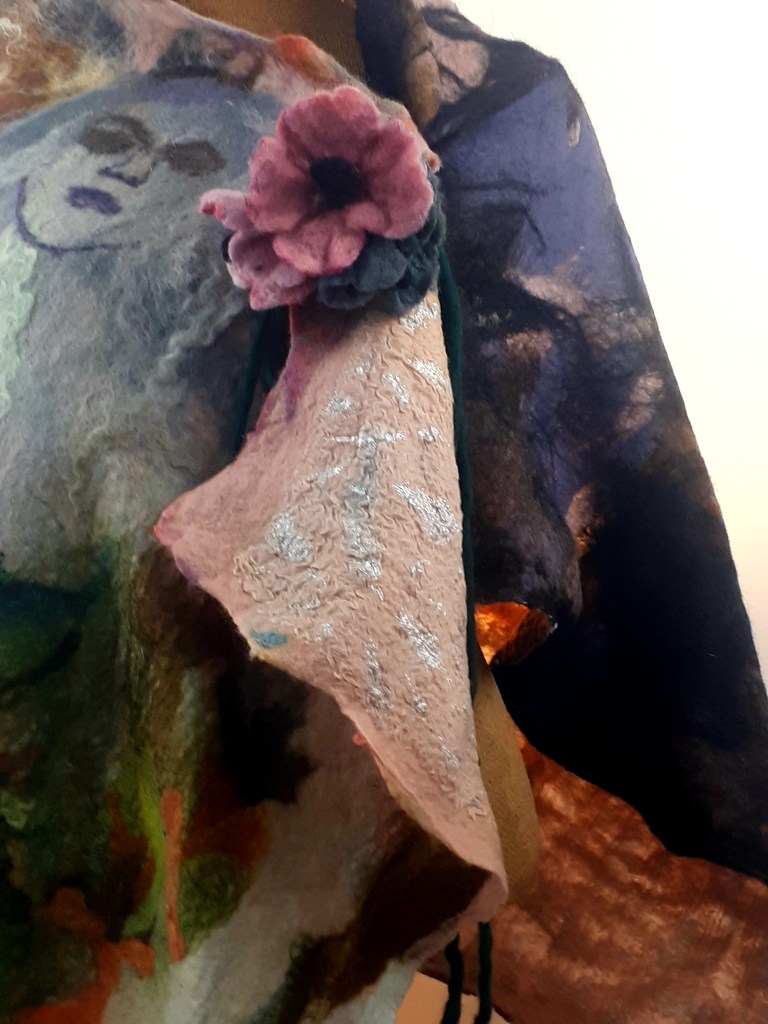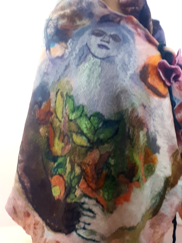 I’ve also really been enjoying using resists to create seamless pieces, like my one piece “Peas on Earth” cowl with 3D pea pods on vintage acid green silk and “SuperHero” , a reversible cowl with lightening bolt cutouts revealing the neon coloured sari silk underneath.